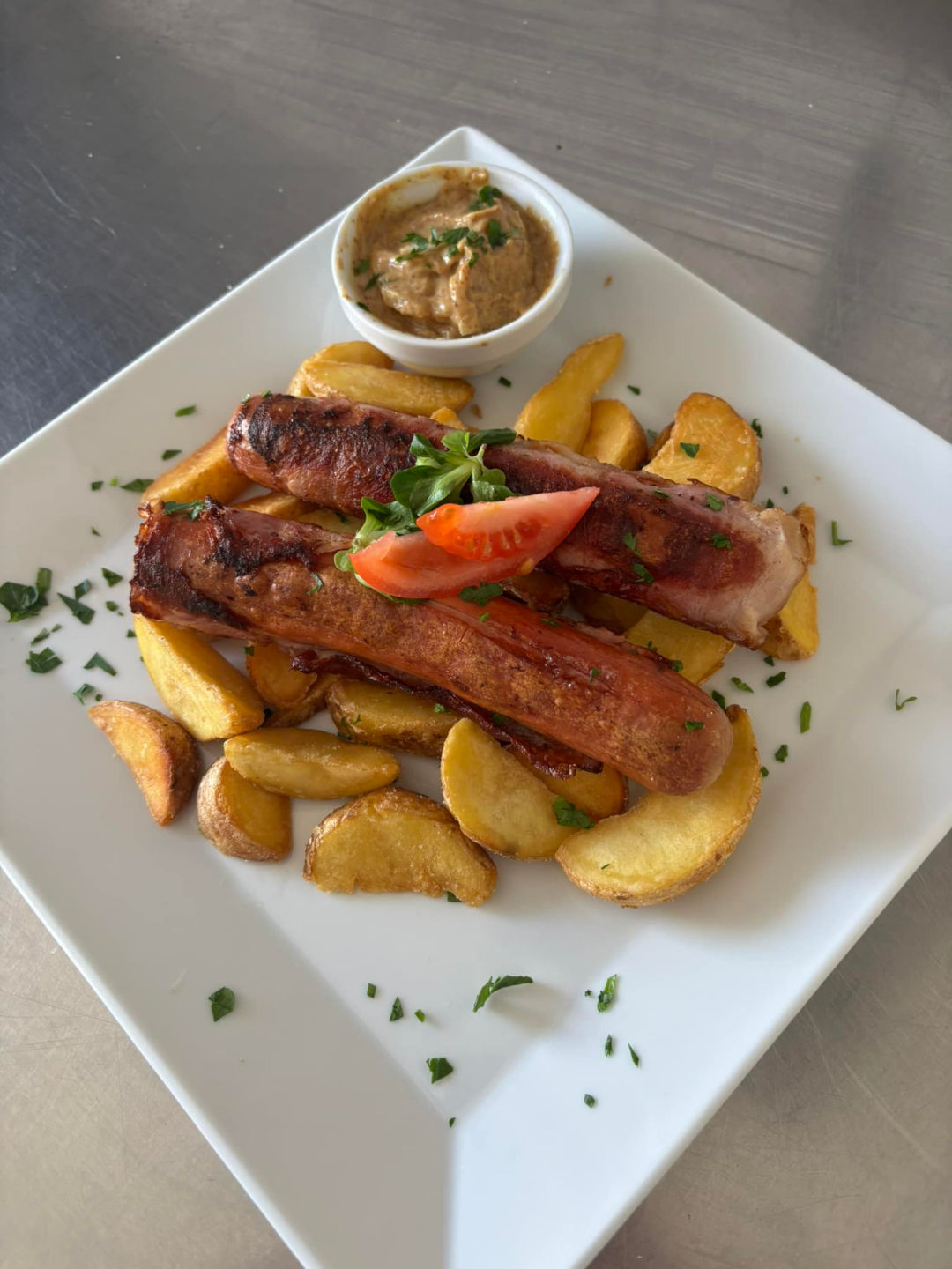 Unsere saftigen Angus- oder Chicken-Burger – mit hausgemachter Sauce, frischem Gemüse und knusprigen Pommes serviert.